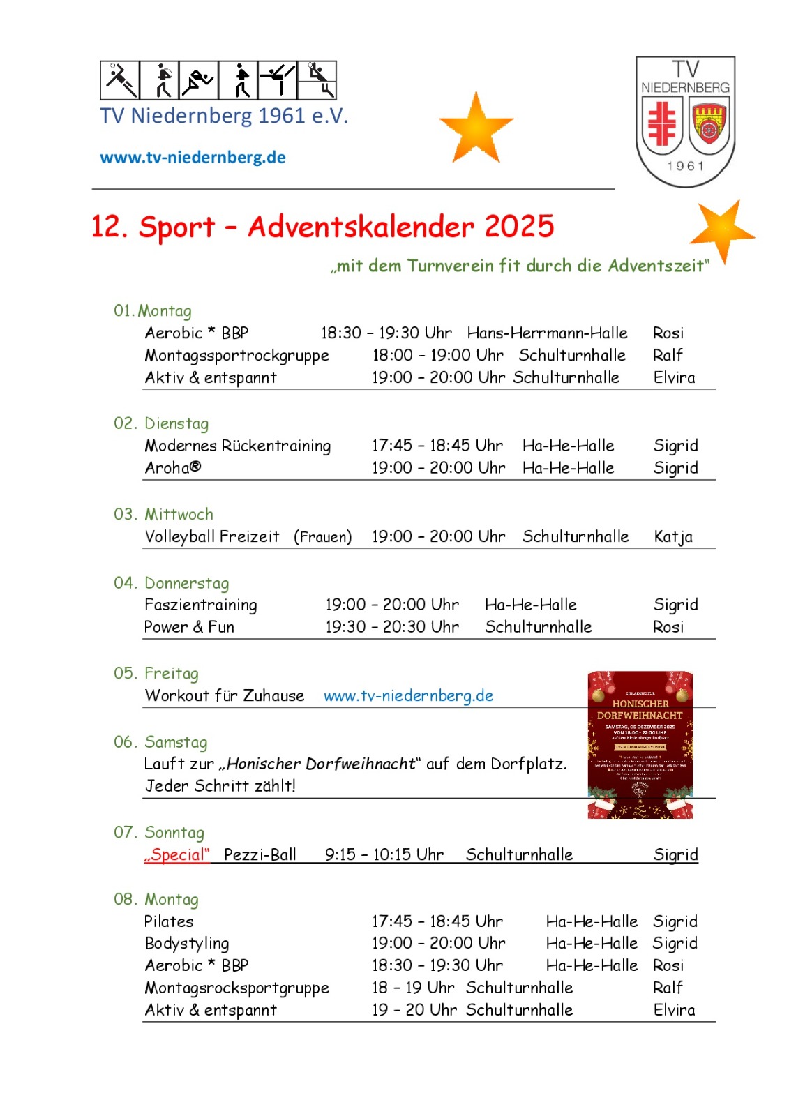 Cardio Fitness 08:30 – 09:30 Hans-Herman-Halle DorisTrampolin Fitness 18:00 – 19:00 Hans-Herman-Halle AlexisFaszientraining 19:00 – 20:00 Hans-Herman-Halle SigridPower & Fun 19:30 – 20:30 Schulturnhalle Rosi