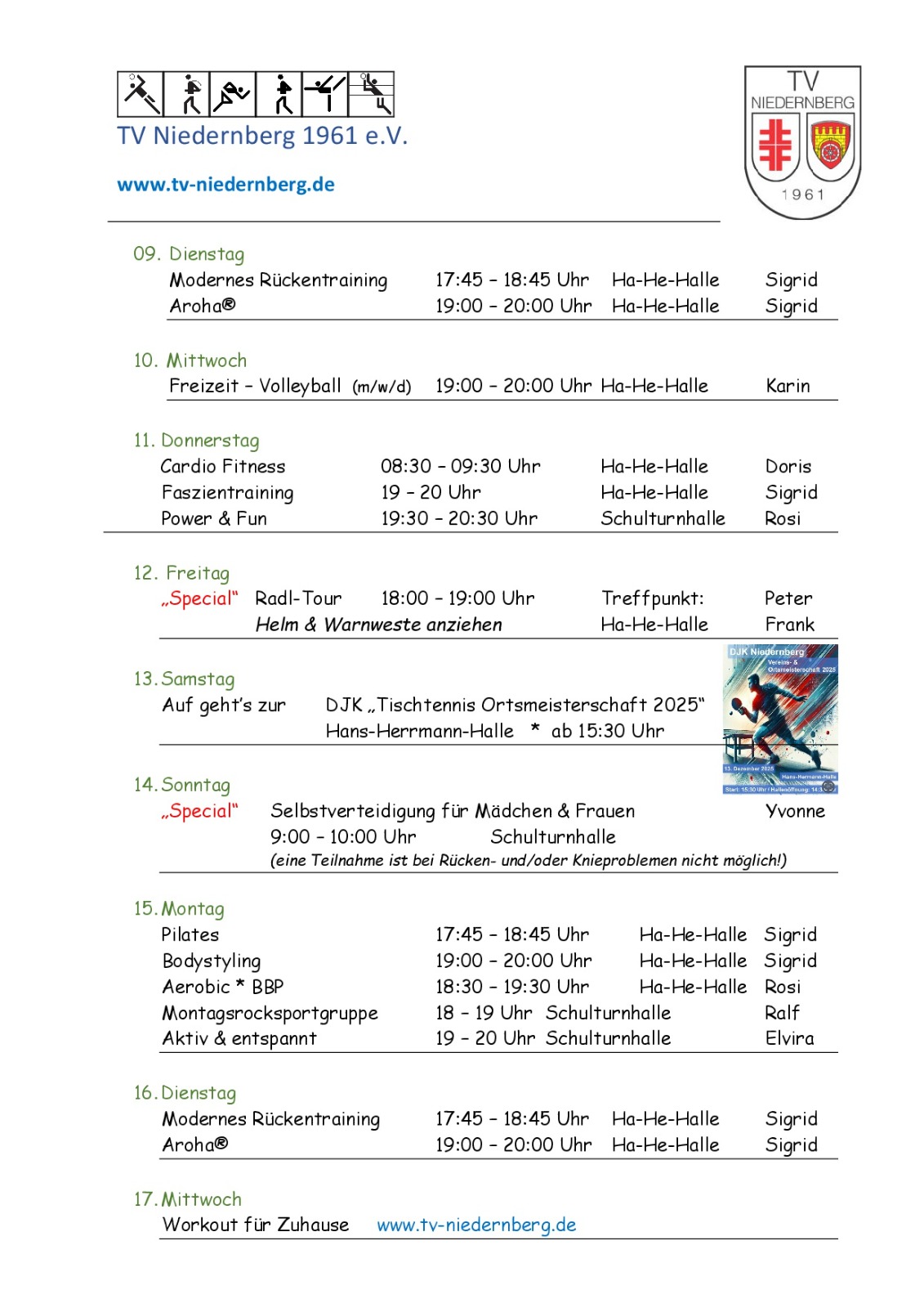 Cardio Fitness 08:30 – 0930 Hans-Herman-Halle DorisFaszientraining 19:00 – 20:00 Hans-Herman-Halle SigridPower & Fun 19:30 – 20:30 Schulturnhalle Rosi